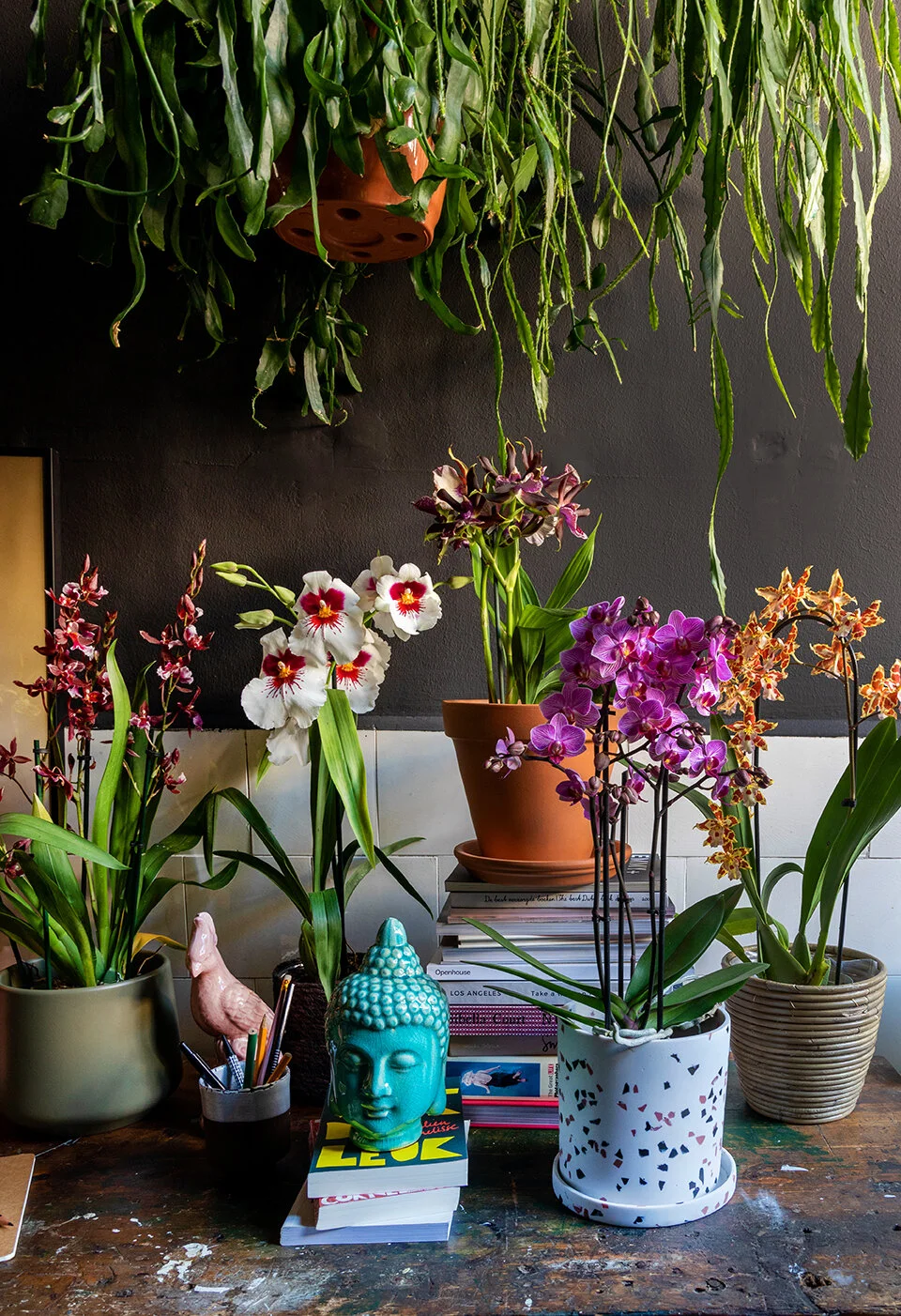 TIP: Combineer materialen en de orchideeën met elkaar. En probeer ook niet voor één kleur te kiezen in zowel de plant als de bloempotten of manden. Dat maakt het spannend!