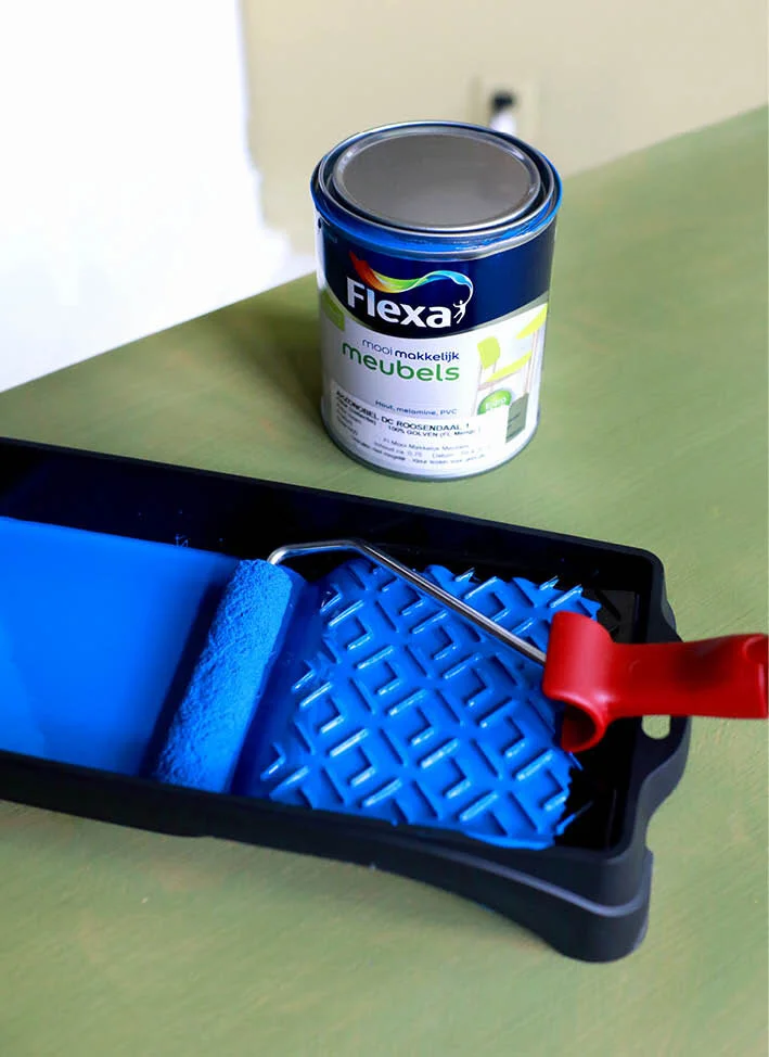 Voor de poten geldt eigenlijk het zelfde als het blad, twee lagen lakken zodat de kleur echt naar voren komt. De poten heb ik eerst met een kwast geverfd bij de randen die ik op afdekfolie stonden en daarna heb ik met de verfroller de poten gelakt. Hierdoor krijg je geen strepen en worden de verflagen mooi glad. Voor de poten heb ik gekozen voor de kleur ‘Mooi olijfgroen’.